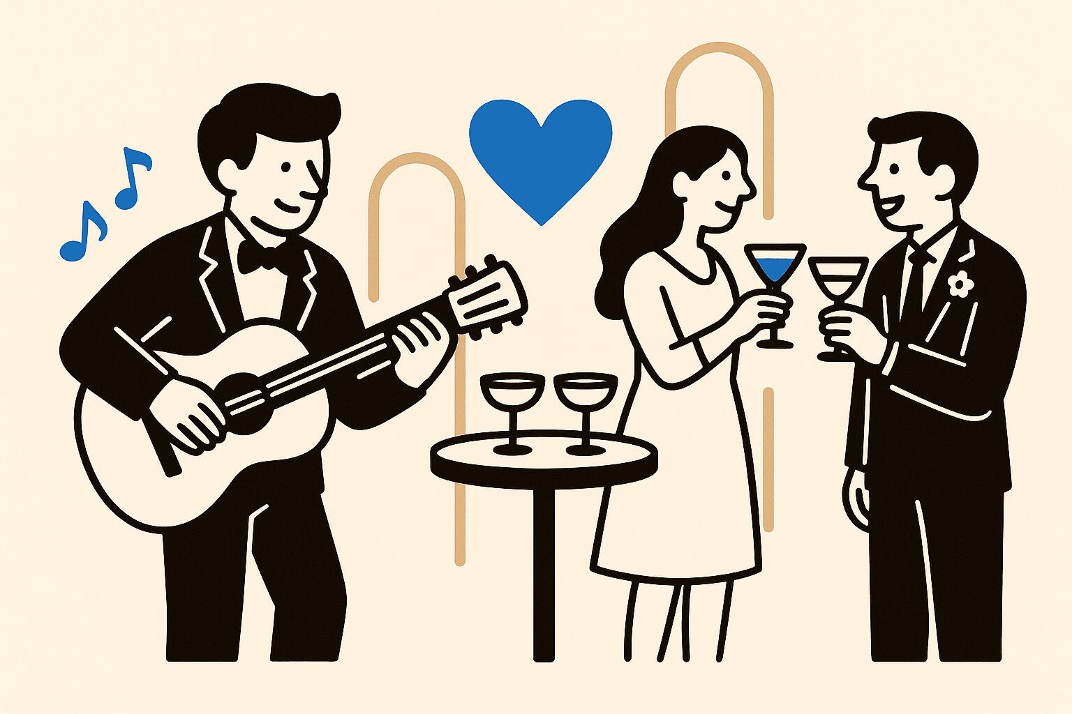 This is where the vibe lifts. Modern pop, classics, and tasteful throwbacks—reimagined on solo guitar—keep the energy up while still letting conversation flow. It’s the perfect backdrop for photos, mingling, and a signature drink.